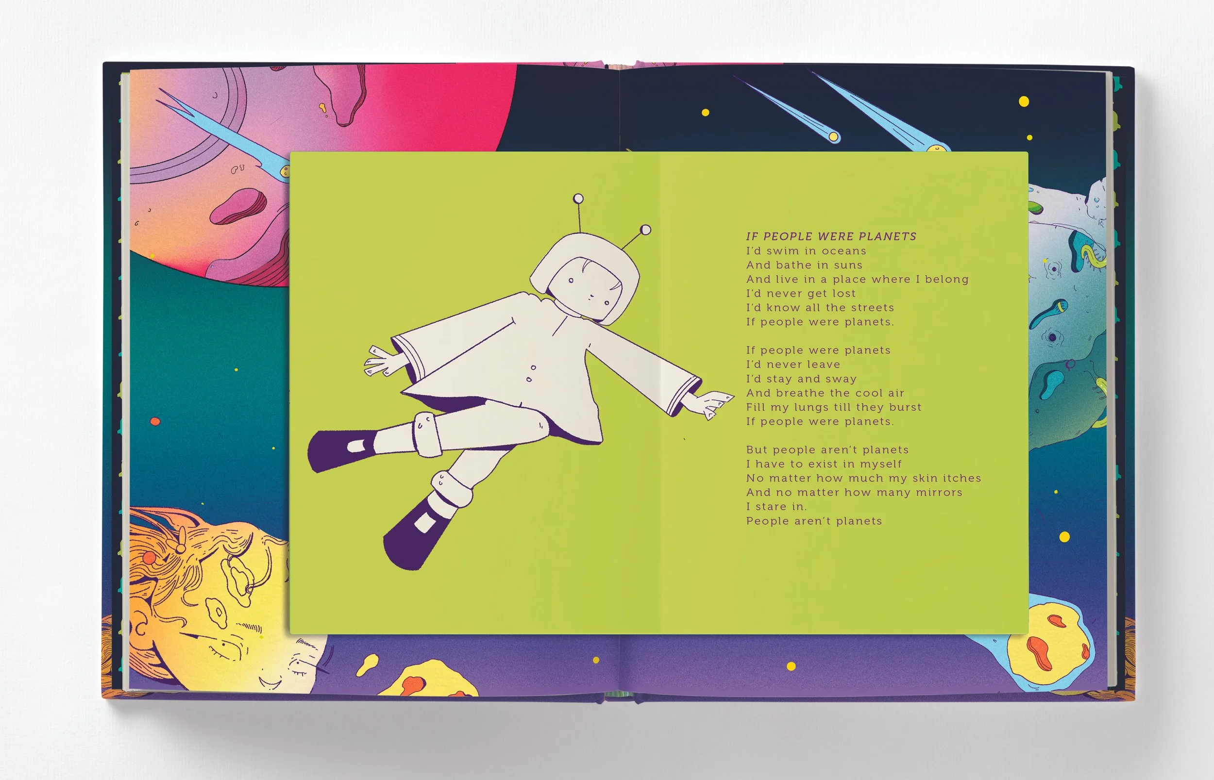 The finished design is 27 spreads, including end pages, front cover and back cover. Each spread is fully colored and inked. There is a total of 6 poems and 5 planets. In order to effectively tell the story, designing the layout was crucial to the project’s success. Each ‘chapter’ opens with a full spread illustration of the main character arriving to a new planet. The planet is briefly introduced with factual information that relates to fictional environment in consequential spreads.